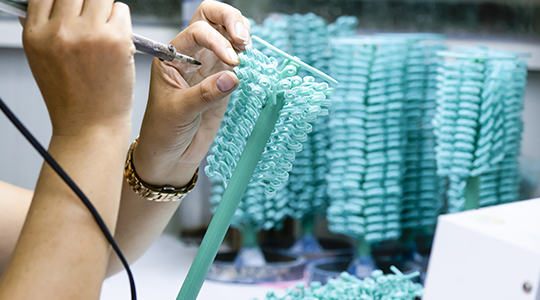 يتم تجميع عدة نماذج شمعية في شجرة صب واحدة، مما يساهم في تحسين كفاءة العملية وضمان نتائج متسقة