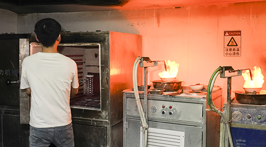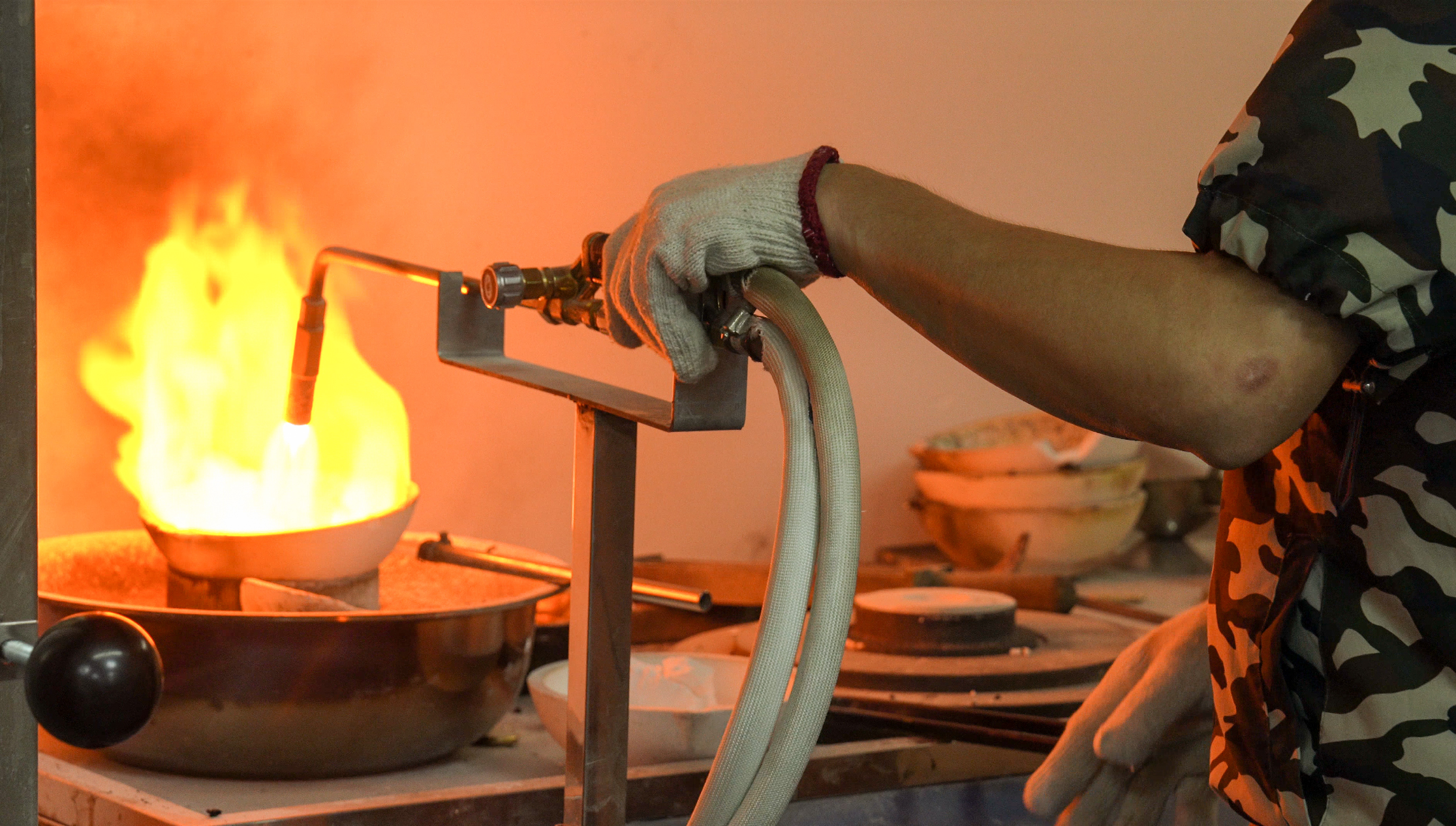يُسكب المعدن المنصهر مثل الفضة أو النحاس أو الذهب في التجويف لتشكيل قطع المجوهرات بدقة وثبات عاليين.